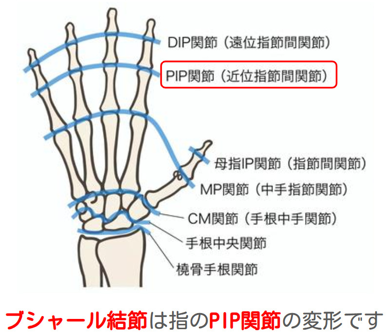 ブシャール結節とは、手の「第二関節(PIP関節)」に骨の変形や腫れ、痛みが現れる症状です。